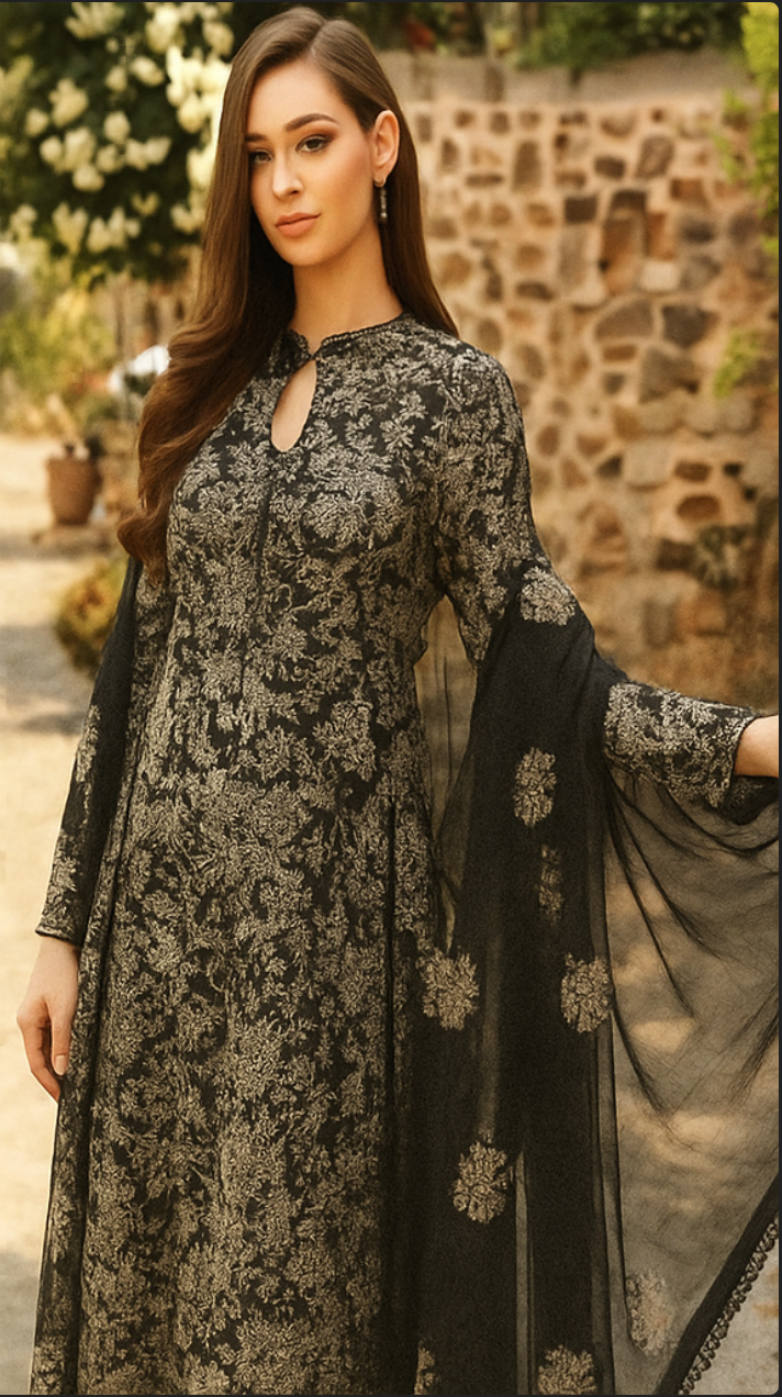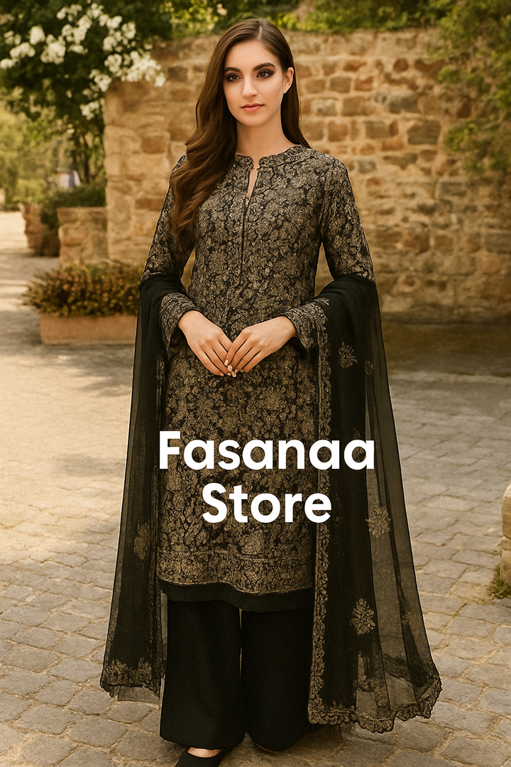 Step into timeless sophistication with Midnight Elegance — a luxurious black Dhanak outfit adorned with intricate silver embroidery ✨. Crafted to perfection, this stunning 3-piece ensemble blends traditional charm with a touch of modern grace 💫. The soft and cozy Dhanak fabric ensures comfort and elegance, making it the ideal choice for winter soirées and festive gatherings ❄️🌸. Paired with a beautifully embroidered dupatta and matching trousers, this outfit redefines refined glamour.