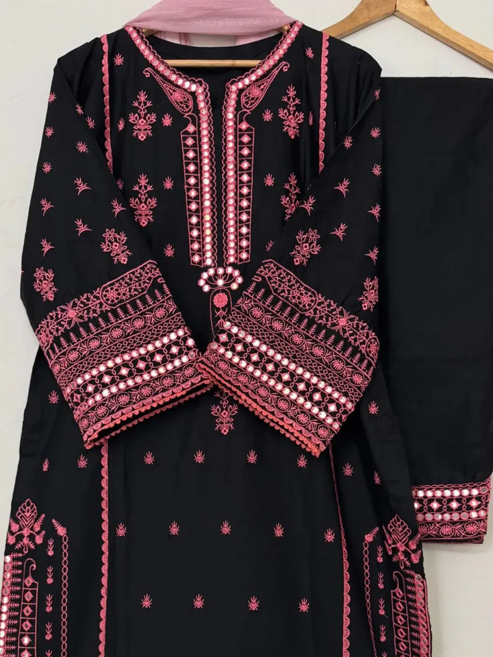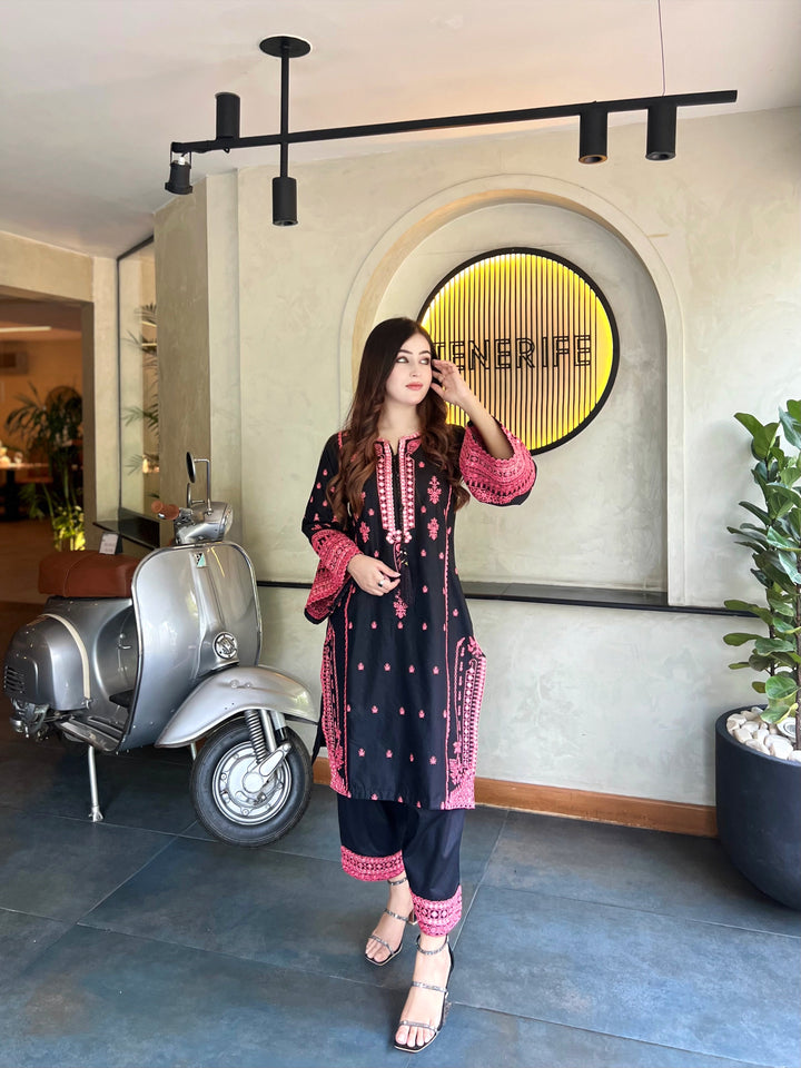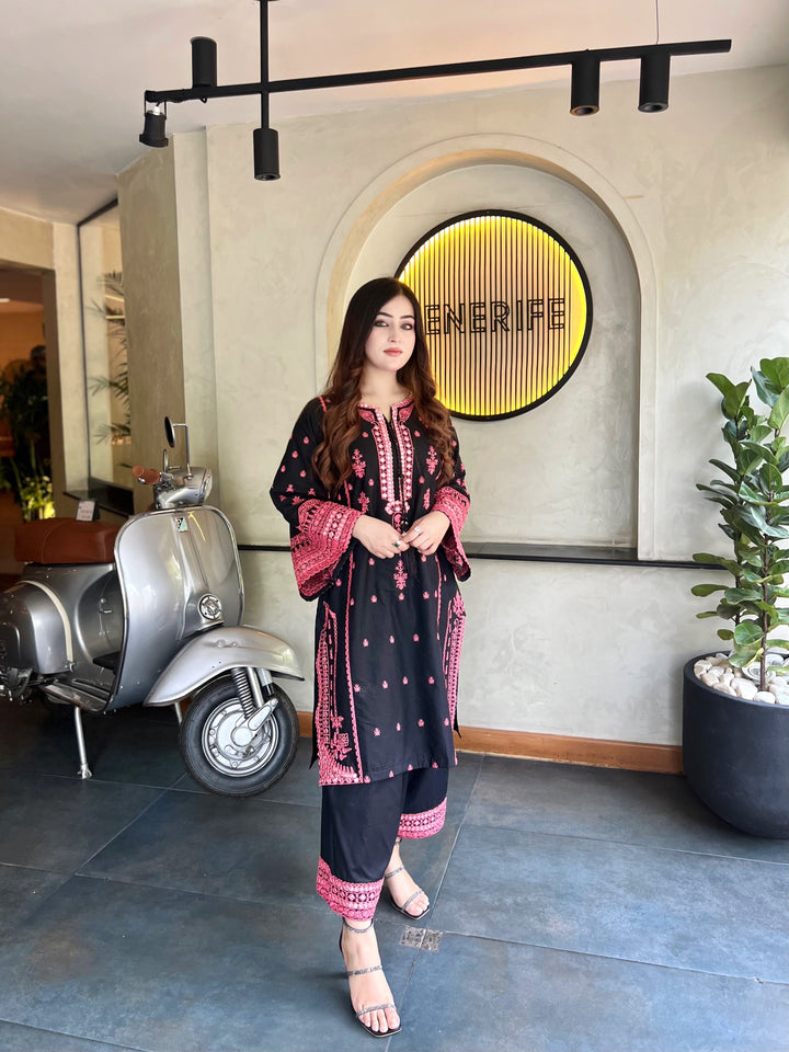 Elevate your wardrobe with this stunning black Embroidered outfit, beautifully adorned with intricate pink embroidery. The delicate threadwork on the neckline, sleeves, and hem adds a touch of timeless elegance, making it perfect for festive occasions, formal gatherings, or evening wear.
